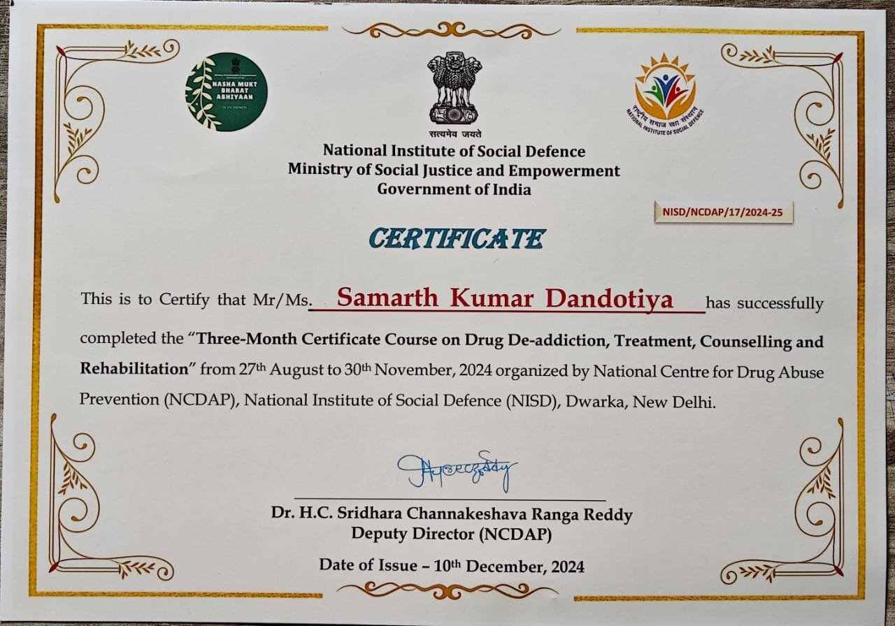 • हमारा नशा मुक्ति के क्षेत्र में प्रयास काफ़ी संतोषजनक रहा है, हमारे यहाँ से इलाज का लाभ लेने वाले मरीजों में करीब 85 प्रतिशत नशे से दूर हैं।