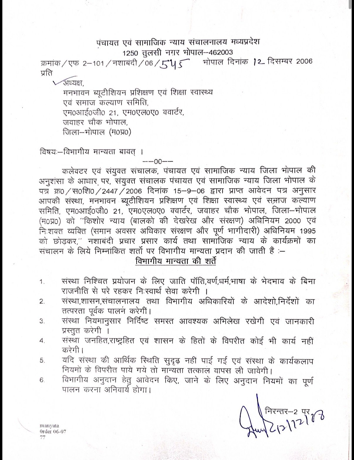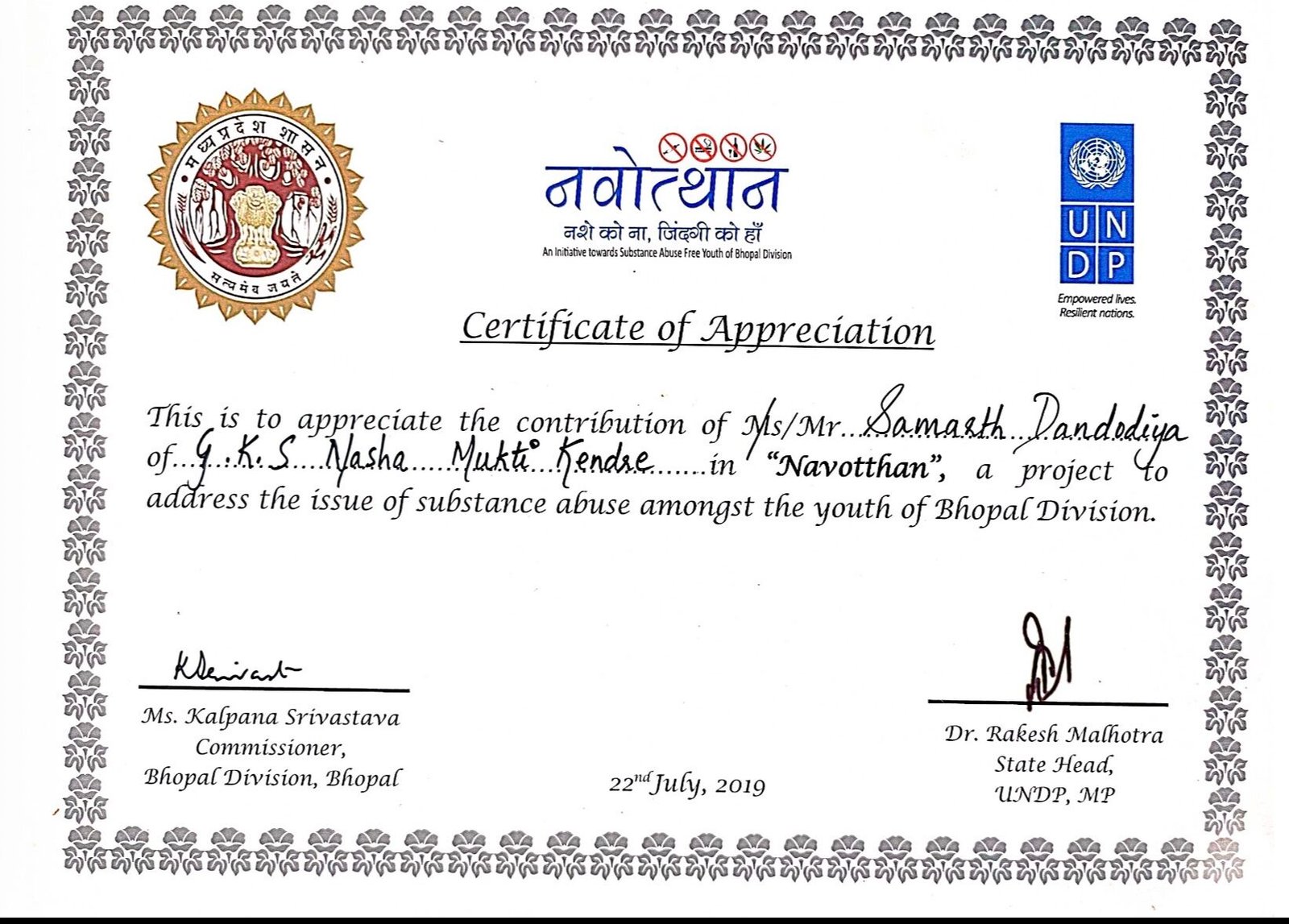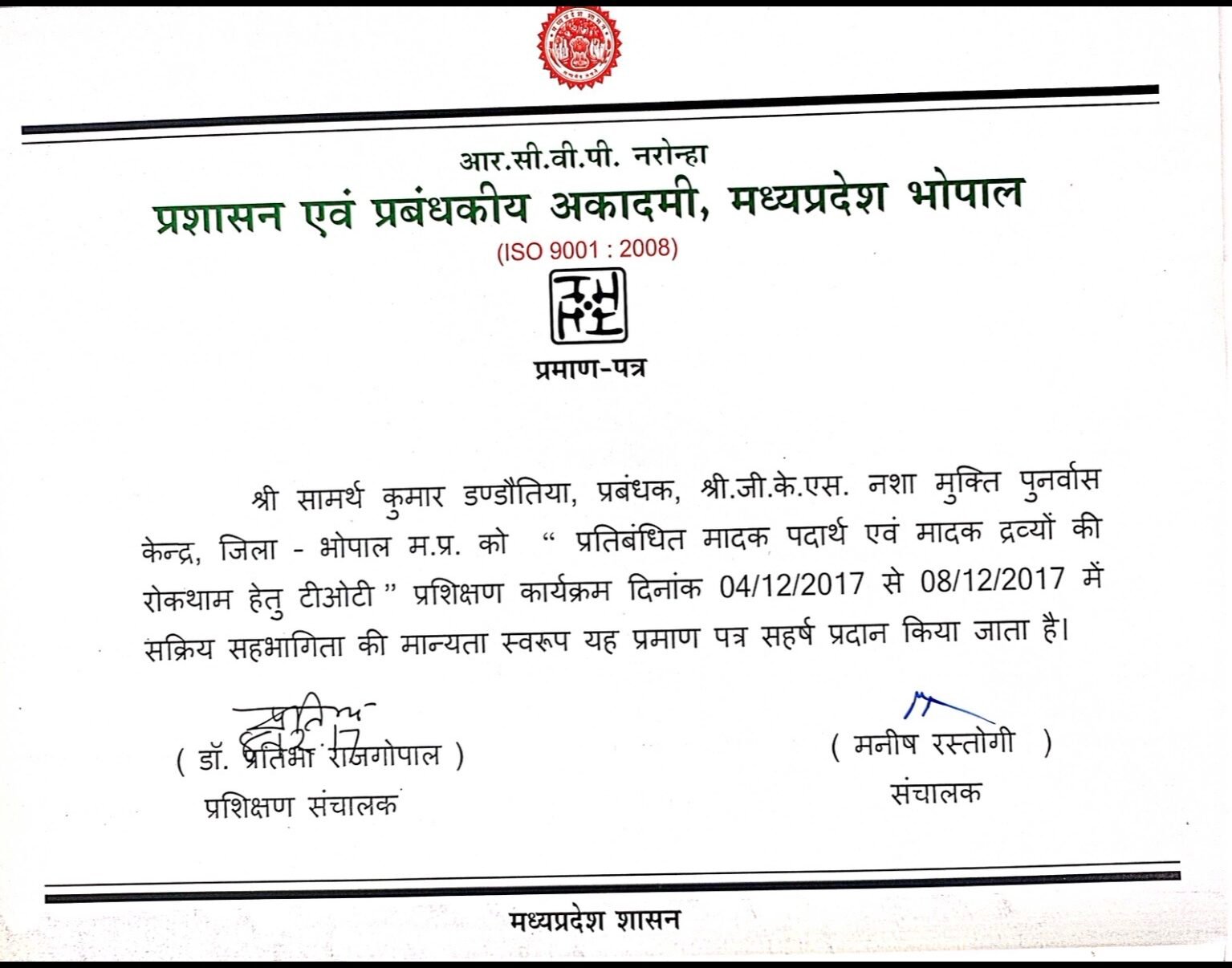 श्री जीकेएस नशा मुक्ति केंद्र मनभावन ब्यूटीशियन प्रशिक्षण एवं शिक्षा समिति (एन.जी.ओ) द्वारा संचालित है, जो की मध्य प्रदेश शासन के सामजिक न्याय एवं निःशक्तजन कल्याण विभाग (Social Justice and Disability Welfare Department Madhya Pradesh) द्वारा मान्यता प्राप्त (*Govt.Approved*) है।